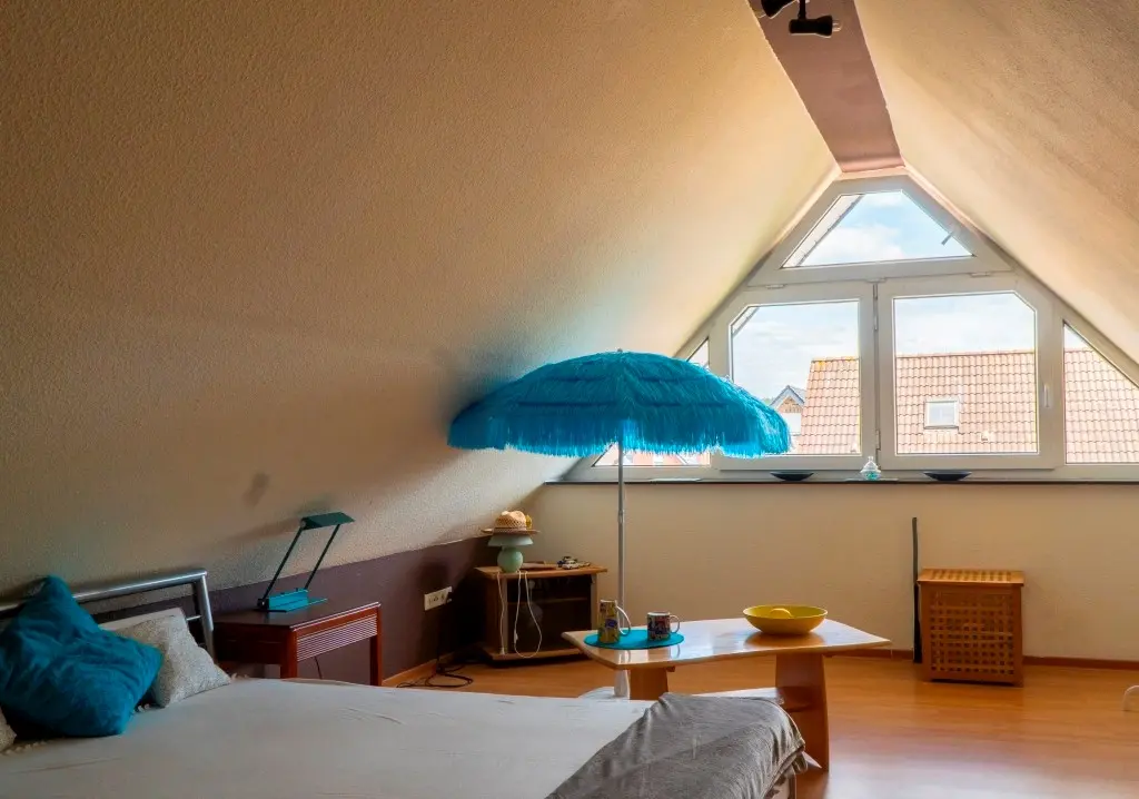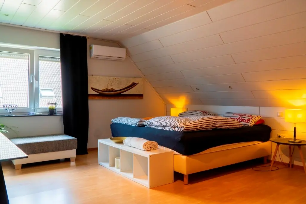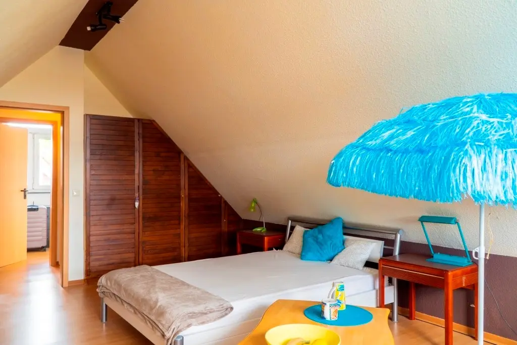 Hier bevinden zich drie lichte slaapkamers en een ruime badkamer met ligbad, douche, toilet en wastafel. De hoofdslaapkamer is voorzien van airconditioning, die zorgt voor een aangenaam klimaat in de gehele verdieping. De omgebouwde zolder biedt extra ruimte, bijvoorbeeld als hobby- of werkkamer.