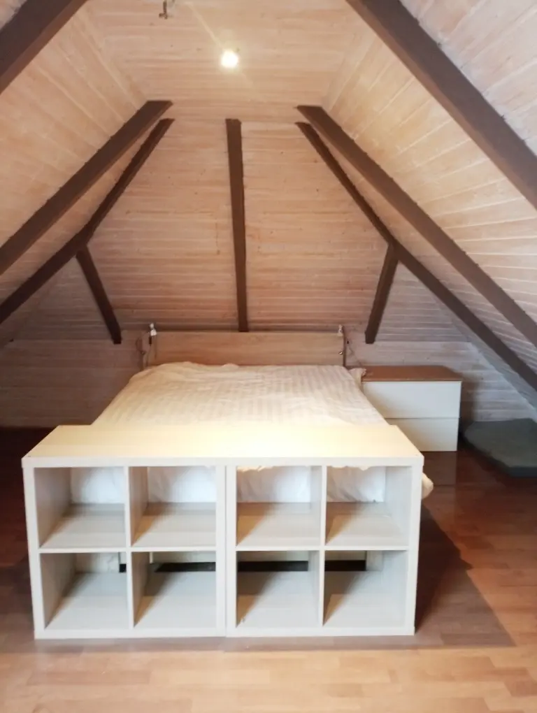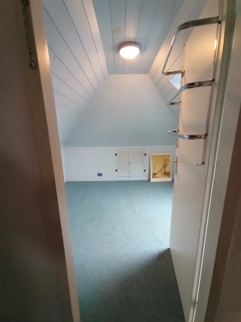 De bovenverdieping beschikt over een overloop met twee slaapkamers: een ruime hoofdslaapkamer met ligbad en een tweede, kleinere kamer – ideaal als kinderkamer of werkplek.